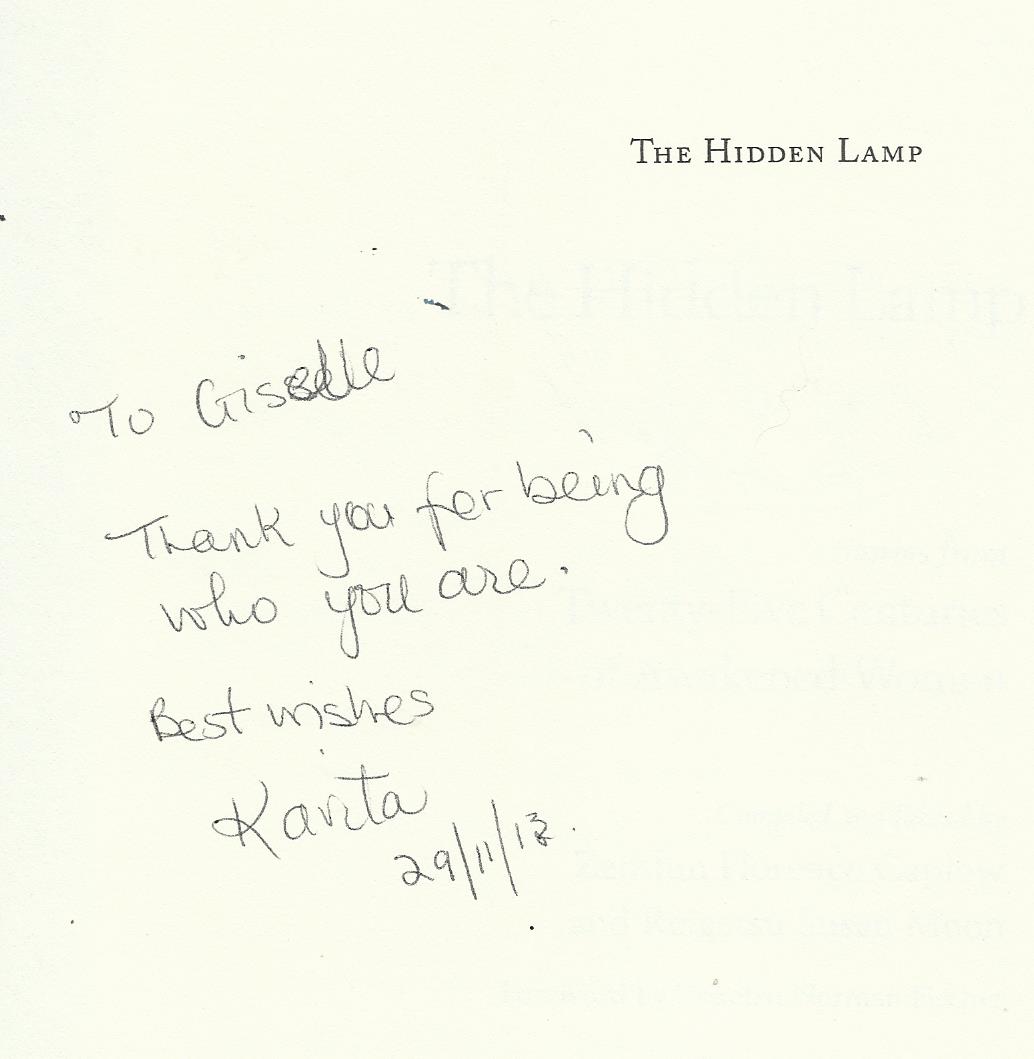 My friend Kavita died yesterday. For Christmas she had sent me a book called *The Hidden Lamp*. On the inside she inscribed: