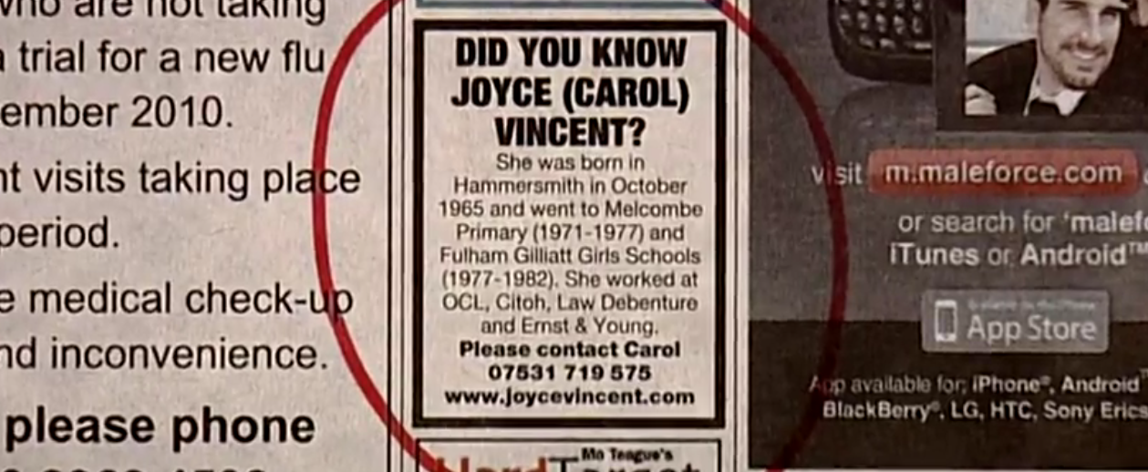 My first contact with this story was a Facebook post “Do you know this woman? Her name is Joyce Carol Vincent. This is a British born woman whose father came from Grenada and her mother came from India. She had four sisters. She was known to have met Nelson Mandela, Gil Scott Heron, soul singer Betty Wright and had dinner with Stevie Wonder.”