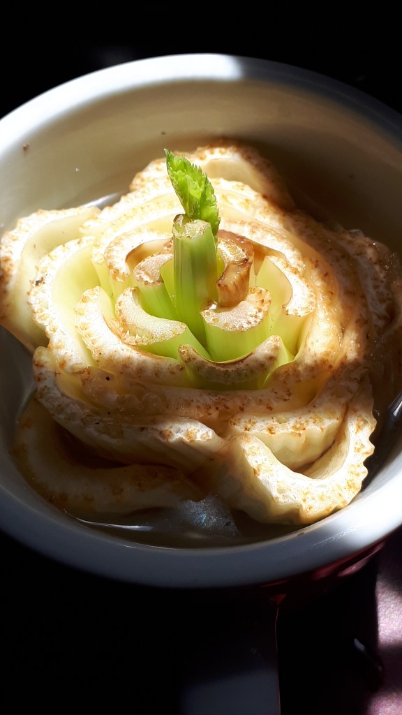 I had cut the last of the celery stalks off this heart of celery and placed the off cut in a cup of water. I had no expectations. Two days later…growth.